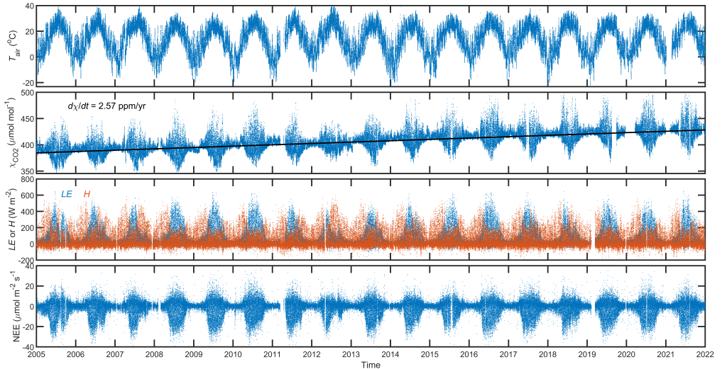 Time series of air temperature (Tair), carbon dioxide concentration (χCO2), latent heat flux (LE), sensible heat flux (H) and net ecosystem carbon dioxide exchange (NEE) at MOFLUX. The carbon dioxide concentration growth rate (2.57 ppm/yr) is consistent with the global mean growth rate.
