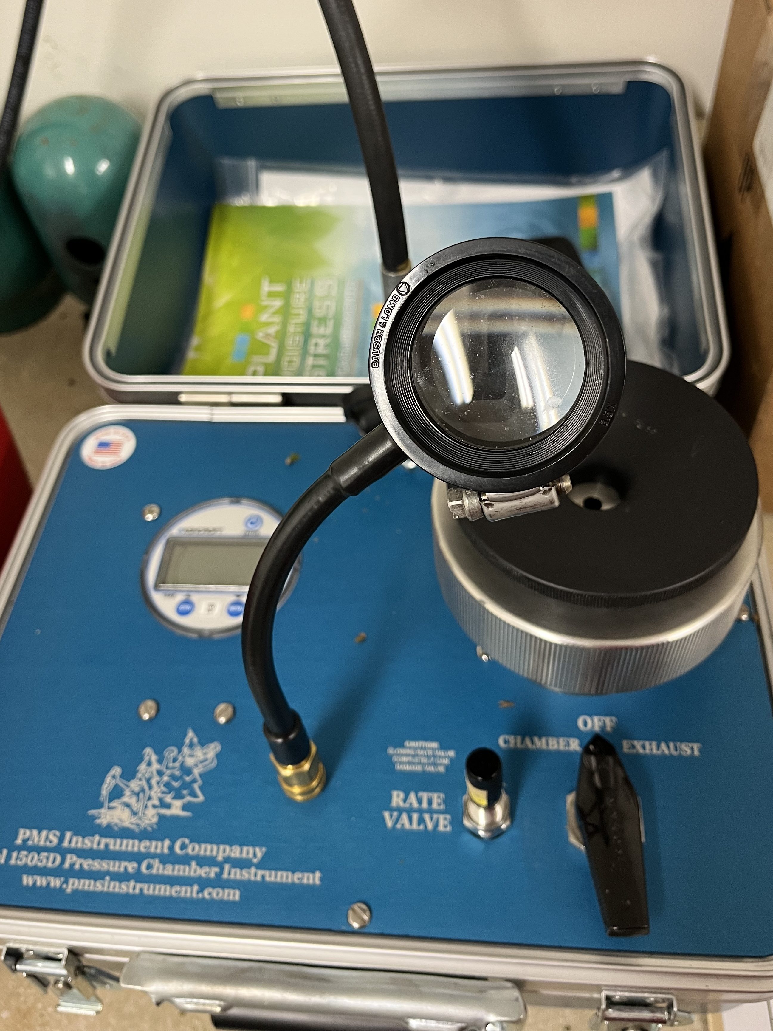 We routinely measure leaf water potential during the growing season. Since 2004, we’ve measured the predawn leaf water potential of six species at weekly to biweekly intervals. In recent years, we’ve also made periodic measurements of midday leaf water potentials.
