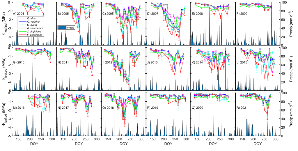 Trees in the MOFLUX forest experience a broad range of water deficit stress. In some years there is very limited stress (e.g., 2009) and in others, intense stress (e.g., 2012). We quantify tree water status by measuring the predawn leaf water potentials (Ψleaf,pd) of different species. As trees dehydrate, the Ψleaf,pd falls from 0 MPa to more negative values. When values fall below −1.5 MPa, the trees are experiencing severe water deficit stress. In years that trees experienced mild to severe water stress, variations of Ψleaf,pd through time often closely track rainfall events, which provide partial rehydration (e.g., 2006, 2011, 2012).