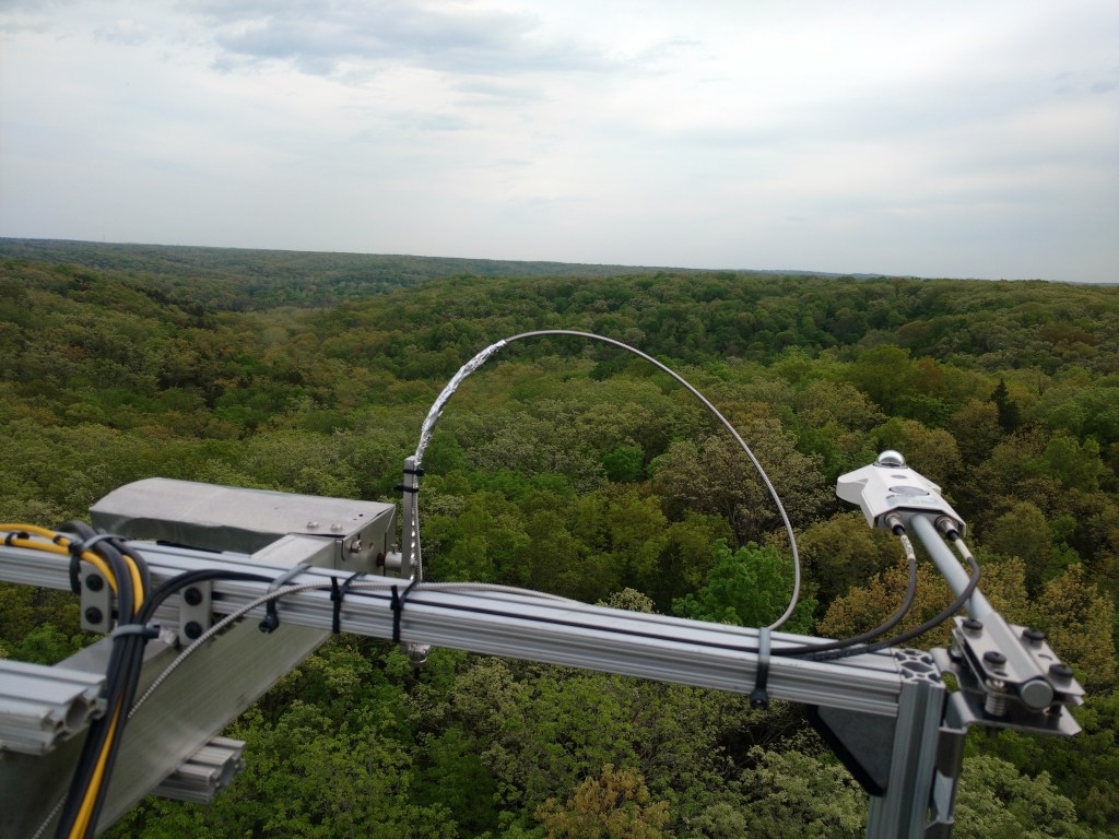 The Missouri Ozarks AmeriFlux (MOFLUX) site was established in 2004 at the University of Missouri’s Baskett Forest in collaboration with scientists in the Environmental Sciences Division of Oak Ridge National Laboratory, and is currently co-led by Lianhong Gu (ORNL) and Jeff Wood (MU). The MOFLUX tower is 105 feet tall and equipped to measure the “breathing of the forest”. A comprehensive suite of other biometric and ecophysiological measurements are maintained to enable understanding of forest functioning from roots-to-shoots, and leaf-to-landscape. Science at MOFLUX aims to enhance scientific understanding and prediction of:
