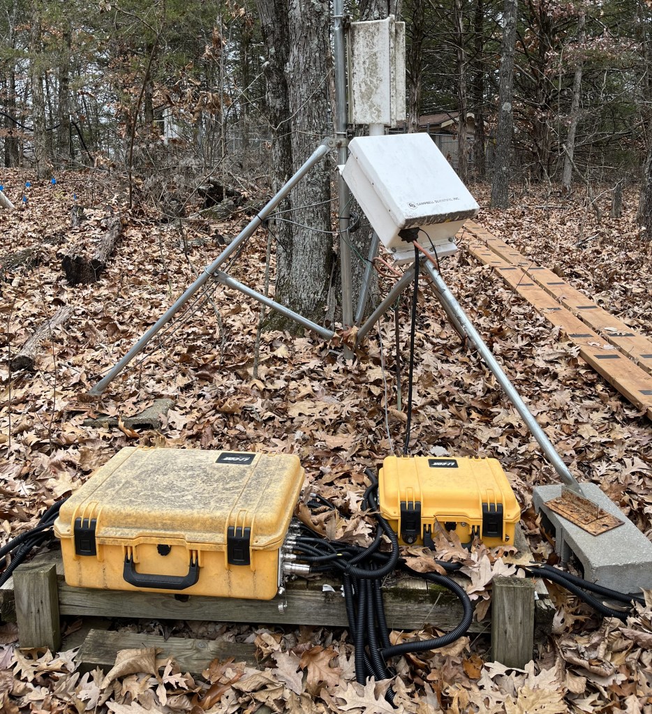 Soil respiration is measured using an auto-chamber system. Sixteen soil chambers are used to measure how much CO2 is emitted by soil respiration, which includes contributions from soil microbes and root growth. Each chamber is equipped with its own soil water content and temperature probes. The chambers close automatically once an hour, at which time the accumulation of CO2 in the enclosed air space is measured to enable calculation of the rate of soil-to-air CO2 movement.